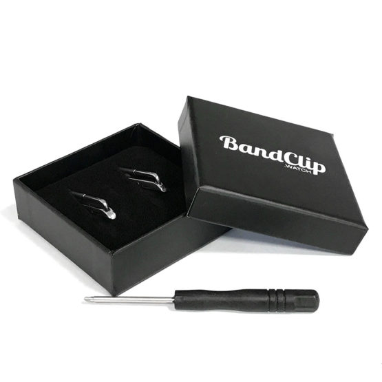 The pair of BandClip screw is sold in a case with black felt. The BandClip with screw is supplied with the screwdriver to undo the 4 clips easily. Screws can be cruciform or pentalobe depending on the model.